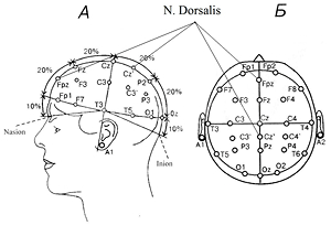 Рис.1 Международная схема расположения электродов. Стрелками указаны точки расположения электродов при нервной стимуляции.