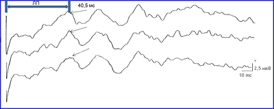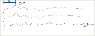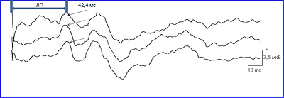 Рис.4 Латентный период (ЛП) у здорового мужчины в пределах допустивой нормы (ЛП N=40-43 мс).